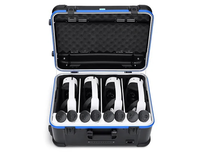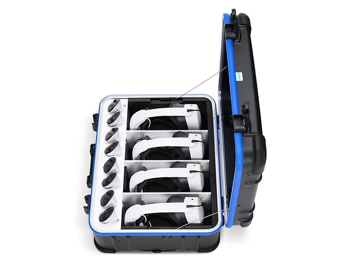 ThezioxiVR transporter cases are great for moving VR headsets between floors & buildings, and even out and about. Charging and protective storage for up to 8 VR headsets and their controllers.