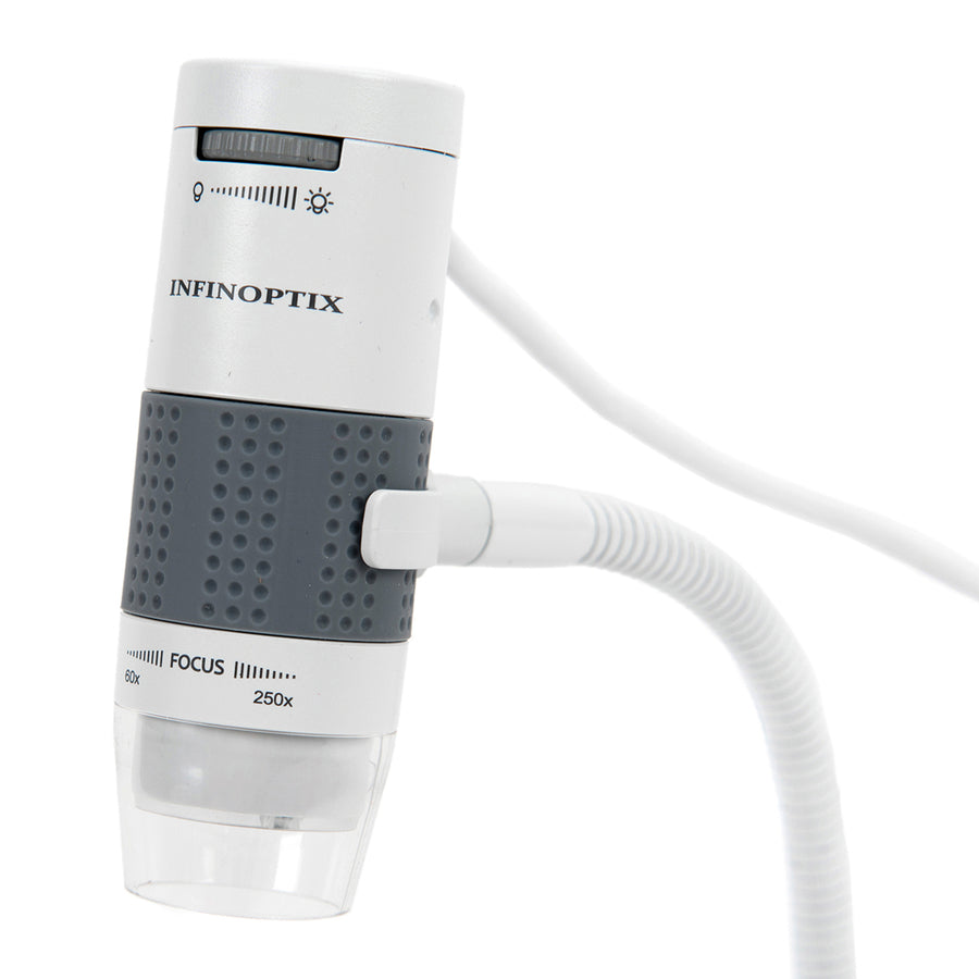 This microscope can be used handheld or attached to a flexible stand, with easy magnification control and quick image capturing.